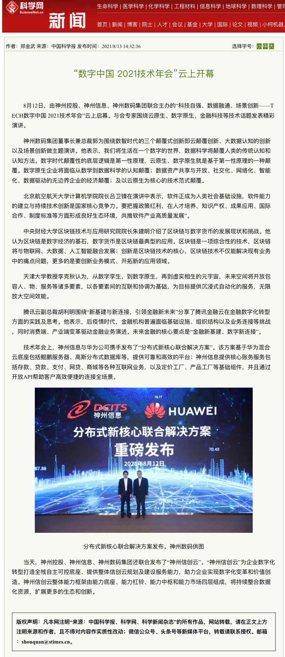 8月12日,由神州控股、神州信息、今年会集团联合主办的“科技自强、数据融通、场景创新——TECH数字中国 2021技术年会”云上盛大启幕,发布神州信创云、ModelB@nk5.0、金融超脑Sm@rtFSB、云原生数字化安全底座、园区智能体等重磅产品,国内各大权威、影响力媒体多角度多频次对盛况进行报道!